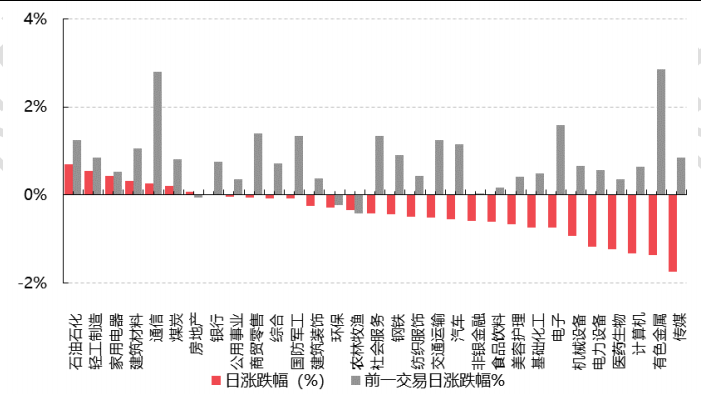 31 个申万一级行业中有 8 个行业上涨。其中,石油石化、轻工制造、家用电器表现居前,涨跌幅分别为 0.71%、0.55%、0.43%,计算机、有色金属、传媒表现居后,涨跌幅分别为-1.34%、-1.36%、-1.75%。沪市有681只个数上涨,占比29.70%,深市有827只个数上涨,占比 28.77%。非 ST 个股中,50 只个股涨停,4 只个股跌停。股指期货主力合约 3 个合约均下跌,其中,3 只期指好于现货指数。