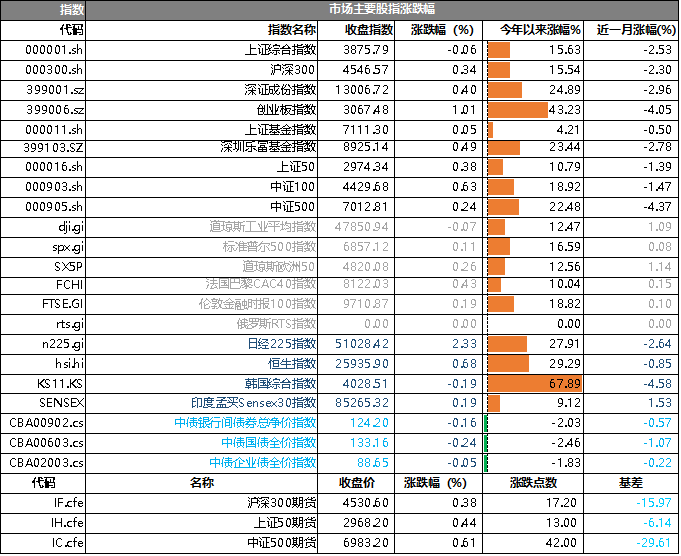 昨日,沪深两市涨跌互现。截止收盘,上证综指收于3875.79点,跌幅为0.06%,今年跌幅15.63%;深成指收于13006.72点,涨幅为0.40%,今年涨幅24.89%;沪深300收于4546.57点,涨幅为0.34%,今年涨幅15.54%;创业板收于3067.48点,涨幅为1.01%,今年涨幅43.23%。两市成交15489.60亿元,较前一日交易量减少7.25%。大盘股强于小盘股。中证100上涨0.63%,中证500上涨0.24%。