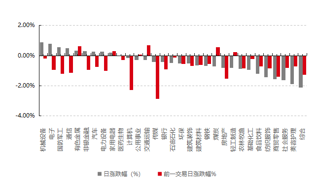 31个申万一级行业中有9个行业上涨。其中,机械设备、电子、国防军工表现居前,涨跌幅分别为0.90%、0.78%、0.55%,社会服务、美容护理、综合表现居后,涨跌幅分别为-1.62%、-1.89%、-2.11%。沪市有666只个数上涨,占比29.04%,深市有743只个数上涨,占比25.84%。非ST个股中,40只个股涨停, 234只个股跌停。股指期货主力合约3个合约均上涨,其中,3只期指好于现货指数。
