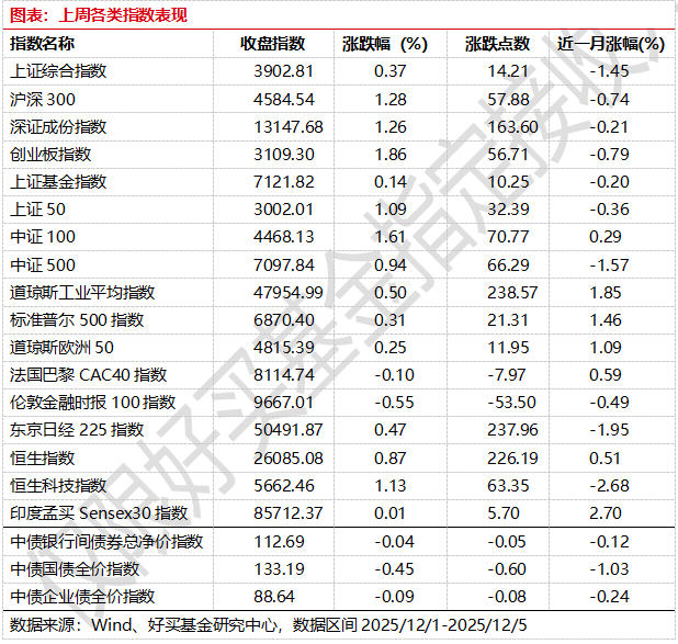 上周,沪深两市双双收涨。截止收盘,上证综指收于3902.81点,涨14.21点,涨幅为0.37%;深成指收于13147.68点,涨163.60点,涨幅为1.26%;沪深300收于4584.54点,涨57.88点,涨幅为1.28%;创业板收于3109.30点,涨56.71点,涨幅为1.86%。