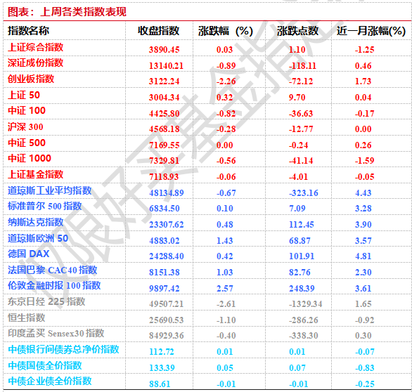 上周,欧美主要市场普遍上涨,其中,道指下跌0.67%,标普500上涨0.10%,纳指上涨0.48%;道琼斯欧洲50 上涨1.43%。亚太主要市场普遍下跌,其中,恒生指数下跌1.10%,日经225指数下跌2.61%,印度孟买Sensex30指数下跌0.40%。
