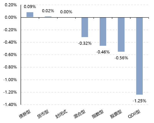 上周,国内权益基金普遍下跌,其中股票型基金平均下跌0.56%,混合型和指数型基金平均分别下跌0.32%和0.46%。QDII基金平均下跌1.25%。