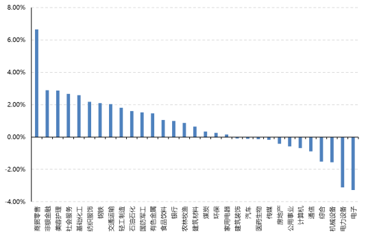 31个申万一级行业中有19个行业上涨。其中,商贸零售、非银金融、美容护理表现居前,涨跌幅分别为6.66%、2.90%、2.87%,机械设备、电力设备、电子表现居后,涨跌幅分别为-1.56%、-3.12%、-3.28%。