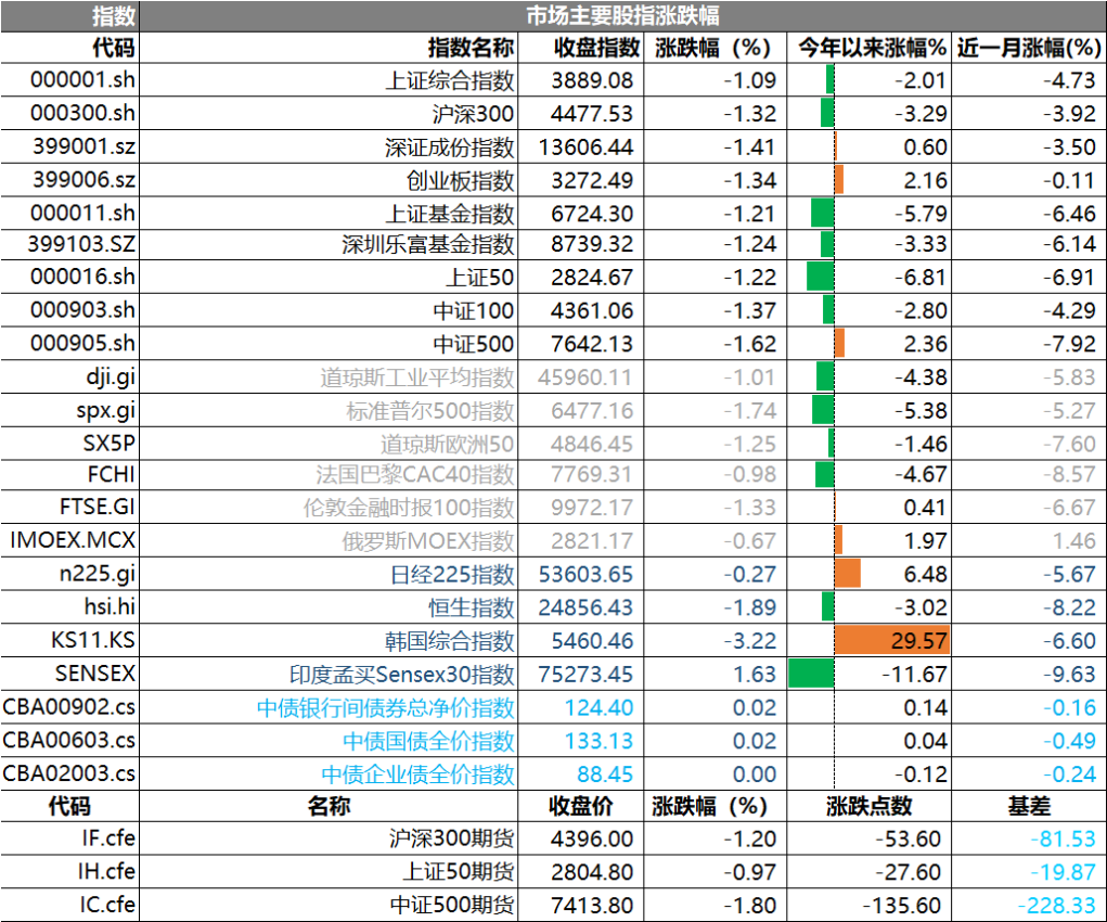 昨日,沪深两市双双收跌。截止收盘,上证综指收于3889.08点,跌幅为1.09%,今年跌幅2.01%;深成指收于13606.44点,跌幅为1.41%,今年跌幅0.60%;沪深300收于4477.53点,跌幅为1.32%,今年跌幅3.29%;创业板收于3272.49点,跌幅为1.34%,今年跌幅2.16%。两市成交19436.03亿元,较前一日交易量减少10.84%。大盘股强于小盘股。中证100下跌1.37%,中证500下跌1.62%。