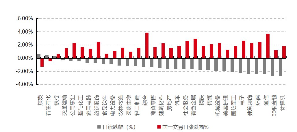 31个申万一级行业中有3个行业上涨。其中,煤炭、石油石化、银行表现居前,涨跌幅分别为0.59%、0.47%、0.37%,通信、非银金融、计算机表现居后,涨跌幅分别为-2.35%、-2.74%、-2.74%。沪市有410只个数上涨,占比17.77%,深市有466只个数上涨,占比16.16%。非ST个股中,46只个股涨停,11只个股跌停。股指期货主力合约涨跌不一,其中,1只期指好于现货指数。