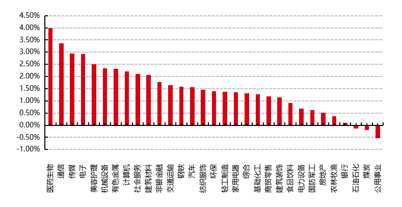 31个申万一级行业中有28个行业上涨。其中,医药生物、通信、传媒表现居前,涨跌幅分别为3.99%、3.36%、2.94%,石油石化、煤炭、公用事业表现居后,涨跌幅分别为-0.13%、-0.19%、-0.52%。