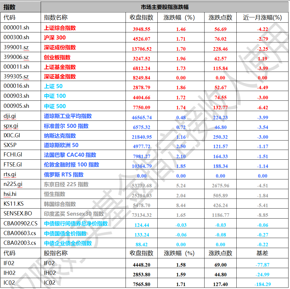 昨日,沪深两市双双收涨。截止收盘,上证综指收于3948.55点,涨56.69点,涨幅为1.46%;深成指收于13706.52点,涨228.46点,涨幅为1.70%;沪深300收于4526.07点,涨76.02点,涨幅为1.71%;创业板收于3247.52点,涨62.57点,涨幅为1.96%。两市成交20124.51亿元,较前一日交易量增加1.00%。小盘股强于大盘股。中证100上涨1.72%,中证500上涨1.74%。