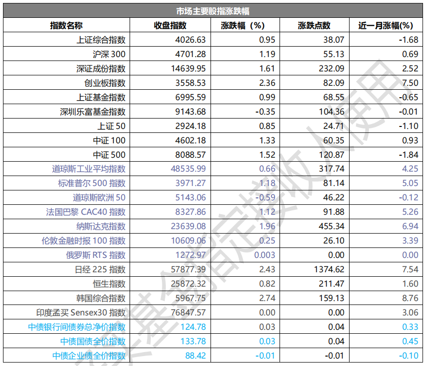 昨日,欧美主要市场涨跌不一,其中,道指上涨 0.66%,标普 500 上涨 1.18%,纳斯达克指数上涨 1.96%;道琼斯欧洲50下跌0.59%。亚太主要市场普遍上涨,其中,恒生指数上涨0.82%,日经225指数上涨2.43%,印度股市休市。