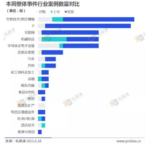 本周,投资、上市和并购共143起事件,涉及总金额461.58亿人民币。共发生103起投资事件,其中披露投资金额事件91起,共计231.89亿人民币。并购市场共发生24起并购事件,披露的交易金额为56.73亿元人民币。上周共有16家企业上市,总融资金额172.96亿人民币,其中,上交所主板3家,上交所科创板5家、深交所创业板5家、港交所3家。
