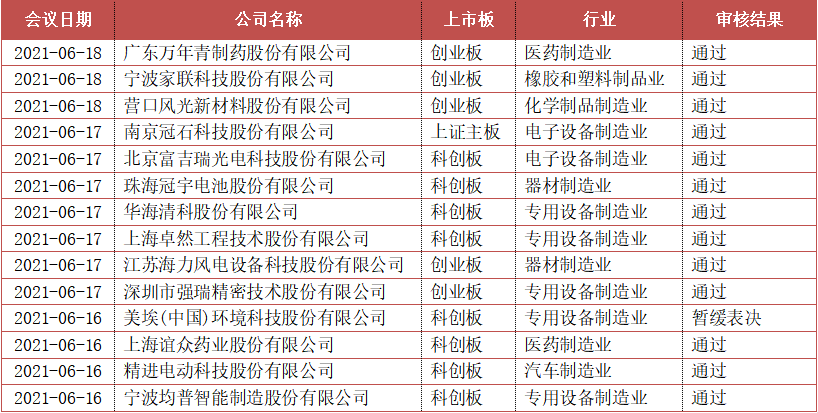 上周,共有14家企业经发审会审核,13家通过审核,1家暂缓表决。