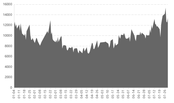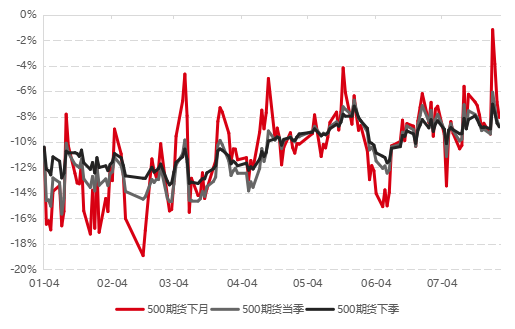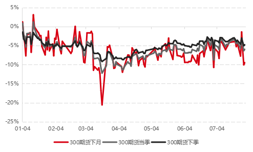 7月随着行情的剧烈变动,股指基差波动加剧,在市场急跌时IC基差快速收缩,月末IC年化基差在8-10%左右。IF基差呈走扩态势,月末根据合约不同年化基差在5-10%之间。