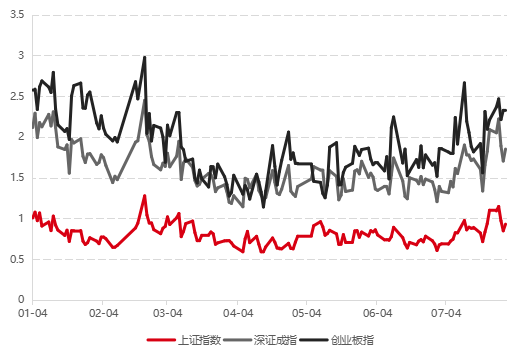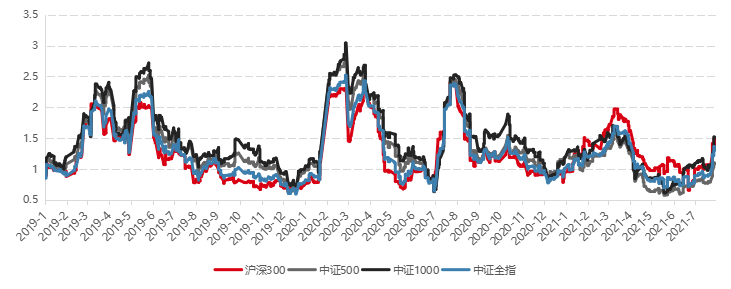 全市场20日波动率7月末迅速拉升,月末位于2019以来68%分位。沪深300和中证1000波动率有明显提升,月末分别回升至历史67.8%、64.1%分位。中证500波动率有提升但仍然相对弱势,月末位于历史34%分位。考虑到指标为滚动20天的波动率,因此7月全月波动率相比6月有明显提升。