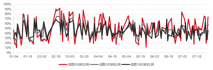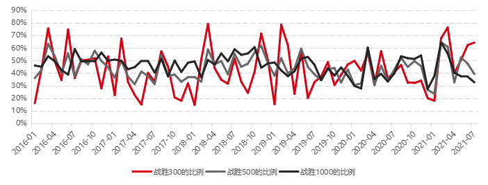 5.战胜指数比例:跑赢500和1000比例再次走低,跑赢300相对容易