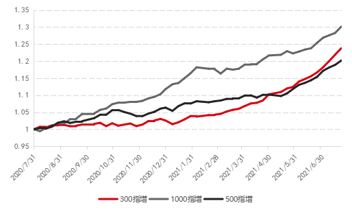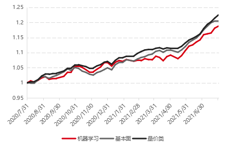 分对标指数看,由于300指数的弱势,300指增平均超额较高,500和1000指增次之,今年二季度以来300指增的超额持续好于500。分策略看,7月的市场环境对量价类策略的发挥比较友好,基本面类策略除月末系统性回调时有所回撤外表现良好,机器学习类策略表现稳定。