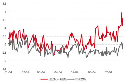 7月份市场活跃度再上台阶,最高单日成交额超1.5万亿元,仅有1天低于万亿,每日两市成交额平均超1.2万亿元,高居历史97%分位。换手率也有明显提升,月末沪、深、创板块换手率分别位于历史82%、76%、58%分位。