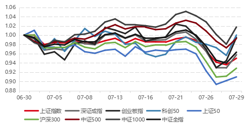 7月A股前期较为温和,月末遭遇一波系统性深度回调,中证全指全月下跌3.88%,上证指数跌5.4%,深证成指跌4.54%。成长风格继续占优,创业板指仅收跌1.06%,科创50收涨0.19%。小盘股明显强于大盘股,中证1000逆市上涨2.52%,中证500微跌0.6%,大盘蓝筹股继续下挫,上证50暴跌10.46%,沪深300大跌7.9%。