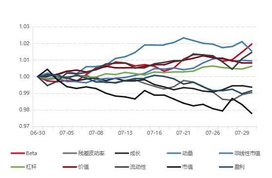 7月表现较好的因子为beta、动量和流动性。本月动量效应较强,特别是上半月表现非常突出。流动性因子终于扭转上半年颓势,收获正收益1.45%。市值因子持续衰退,收益绝对值领涨所有因子,小市值效应明显。波动率因子表现不佳,全月下跌近1%。其他因子方面,成长、盈利因子下跌,价值、杠杆、非线性市值因子上涨。从全月走势看,各风格因子的表现分化度加大。
