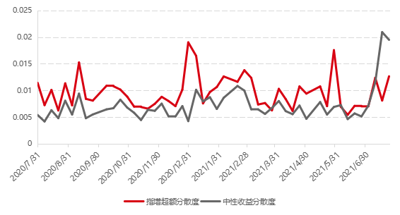 受月末行情影响,截面波动率在7月中下旬急速拉升,各板块的分化度均逼近或创造自2016年以来的历史最高值,月末沪深主板截面波动处于历史95%分位,创业板和科创板创造分化度新高,月末位于历史99.4%分位。分股票组看,沪深300成分股分化度明显提升,沪深300、中证500、中证1000成分股以及剩余小票的月末截面波动分别位于历史99.6%、96.7%、98.5%和97.8%分位。