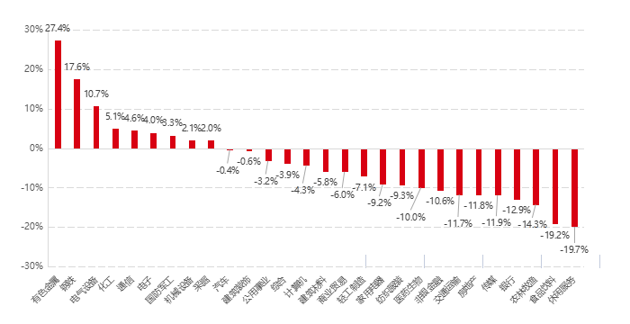 28个申万一级行业跌多涨少,有9个取得正收益,占比不到1/3。有色金属和钢铁行业领涨,其中有色金属单月涨幅近30%,电气设备行业受新能源板块带动表现依旧强势。跌幅最大的是休闲服务和食品饮料,全月下跌近20%,其中休闲服务已连续两月领跑跌幅榜。