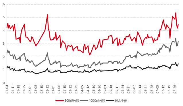 7月市场流动性分布变动不大,月末沪深300、中证500、中证1000成分股以及剩余小票的流动性占比分别为31%、17%、24%、28%。在7月末的剧烈行情中,市场急速下跌时流动性从中证1000和剩余小票流出,流入沪深300,权重股避险效应凸显;超跌反弹时正好相反,资金从沪深300的大票流出,流向小票。而中证500的交易资金占比在此期间持续走低。