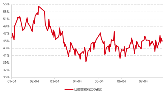 中证1000成分股的日均成交额自二季度以来持续攀升,7月再获明显提升,月末水平已与中证500相差无几。中证500成分股的日均成交额也有明显提升,但成分股之外小票的流动性则无明显变化。以中证1000成分股为代表的小票流动性提升有利于量化策略获取小票超额。同时,7月市场成交集中度不高,成交额排名前200股票占据全市场约45%的成交额。