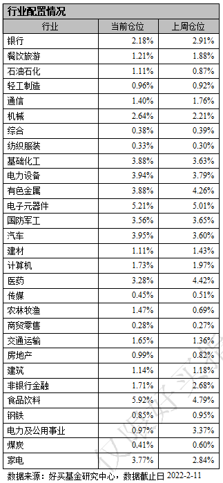 本周,基金配置比例位居前三的行业是食品饮料、电子元器件和汽车,配置仓位分别为5.92%、5.21%和3.95%;基金配置比例居后的三个行业是商贸零售、纺织服装和综合,配置仓位分别为0.28%、0.33%和0.38%。