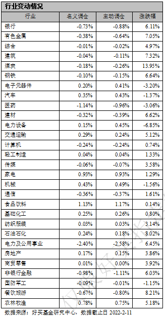 行业配置方面,食品饮料、家电和农林牧渔三个板块被公募基金主动相对大幅加仓,而电力及公用事业、非银行金融和医药逐渐主动减持,与名义调仓基本一致。