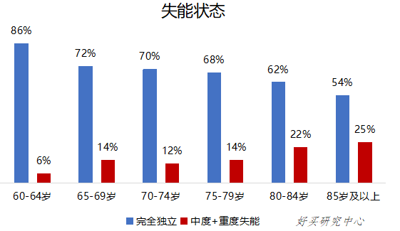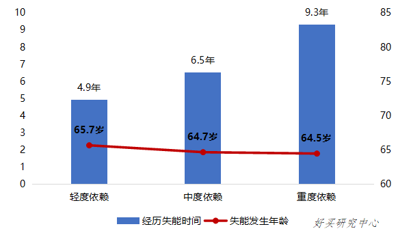据统计,人的一生大约有8年时间处于带病养老状态,因此个人养老规划需要充分考虑老年失能护理需求。如果以ADL(activities of daily living)作为失能状态评定标准,从年龄来看,老年群体的失能状态可大致分为三个阶段:64岁及以前老年群体处于独立阶段,完全独立群体占比较高,中度/重度失能群体占比较小;65-79岁老年群体处于失能问题出现阶段,完全独立群体占比开始下降,中度/重度失能群体占比上升;80岁及以上老年群体处于失能问题加剧阶段,中度/重度失能群体占比明显上升。65岁是老年群体面临失能的重要转折点,失能程度越严重,经历失能的时间越长。