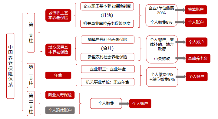 中国养老体系主要由三支柱组成:第一支柱,社会基本养老保险;第二支柱,企业/职业年金;第三支柱,商业养老保险及个人养老账户等。第一支柱为强制性,提供基础保障,由政府和企(事)业单位管理,由城乡居民和职工基本养老保险组成,采取个人缴费、单位缴费/政府补贴的模式,可抵扣企业所得税和个人所得税。第二支柱为非强制性,由企业自愿提供,企业、事业单位管理,采取个人缴费、单位缴费模式,企业缴费不超过工资收入的4%部分可抵扣个人所得税且具有个税递延优惠政策。第三支柱为非强制性商业化运作多支柱养老体系重要组成部分,由保险公司等金融机构提供,采取个人缴费模式,部分具有个人所得税递延纳税优惠政策。