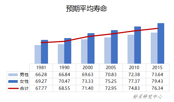 经济学家Kenneth Boulding曾说:“世界上最可怕的两件事是核战争和人类预期平均寿命突然延长至150岁。”中国人口预期寿命的延长得益于逐渐完善的医疗体系,政府不以盈利为目标,投入大量资金建设了覆盖城乡的卫生机构约30万个,而这30万医疗机构也在医疗、预防、保健等方面满足了居民对医疗卫生的需求;同时中国的医疗保障体制覆盖大部分城乡居民,部分解决了居民没有能力就医的问题;中国也在大力普及医疗保健常识(例如:疫苗常识的宣导),提升国民的医疗保健意识。随着医疗体系的发展,中国人口预期平均寿命由建国初期的35岁延长至2015年的76岁,并预测平均每十年预期寿命将延长2-3岁。预期寿命延长带来的长寿风险成为不可忽视的养老风险,更长时间的养老生活意味着消耗更多的养老资金,而如果没有对养老需求资金和长寿风险有清晰认知,长寿带来的养老资金缺口需要人们通过降低养老生活质量和主动寻求额外的退休后收入来源以补充。