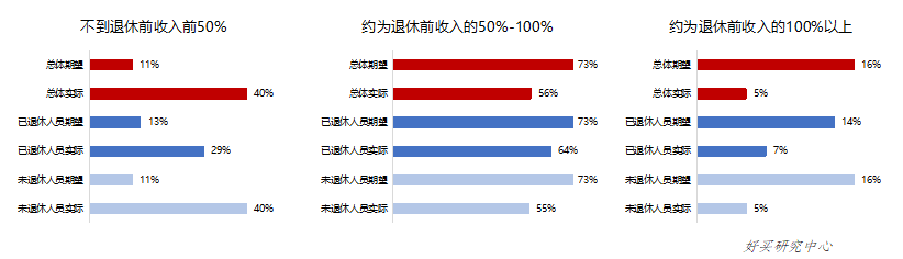 中国保险资产管理业协会发布《中国养老财富储蓄调查报告(2021)》,调查显示未退休人群对退休后收入/退休前收入期望较高,大部分认为退休后收入将超过退休前收入的50%,然而实际情况是退休后收入低于退休前收入50%的情况占比40%,未退休人群对预期退休后收入预估偏高。泰康保险集团与尼尔森联合对中高净值人群进行调查,调查显示中高净值人群对当前生活水准消耗资金缺乏清晰认知,对养老生活总时长缺乏足够感知,产生养老资金预估的失准。