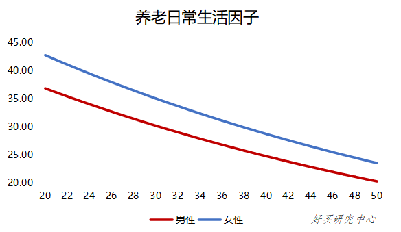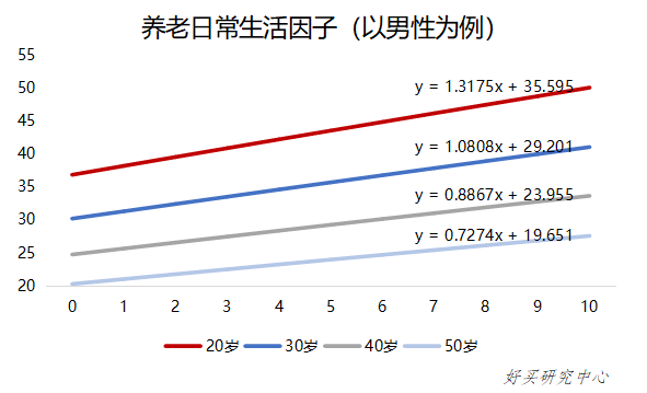 基于精算假设通货膨胀率2%、折现率3.5%,我们得到养老日常生活因子曲线,养老日常生活总需求为根据现在物价水平考虑的养老年需求与养老日常生活因子相乘之积。女性的预期寿命比男性长,各年龄的生存概率比男性高,因此女性养老日常生活因子高于男性。