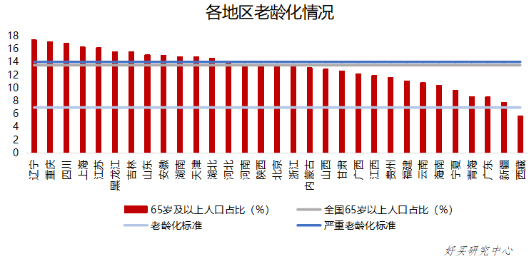 第七次人口普查也显示了全国各省(直辖市)的老龄化情况,其中12个省(直辖市)已进入深度老龄化阶段,全国仅西藏地区还未进入老龄化阶段。部分地区因经济发展缓慢,导致大量年轻人流失,形成严重老龄化局面;部分地区经济发达,医疗系统完善,有效延长居民预期寿命,导致老龄化情况严重。伴随老龄化进程的是家庭户规模逐渐缩小和供养比的大幅增长(定义供养比为某一人口中老年人口数与劳动年龄人口数之比),社会的年轻群体承担更大的养老责任,以家庭赡养为主体的传统养老模式不再适用。