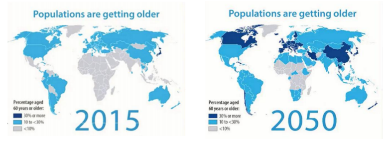 世界卫生组织(WHO)定义:一个国家六十五岁以上的人口占总人口的7%以上即称为老龄化社会(aging society);达14%即称老龄社会(aged society);达20%则称超老龄社会(hyper-aged society)。随着医疗的发展,人类预期寿命延长,生育率的普遍下降,世界范围内普遍出现老龄化趋势,且这种趋势呈现不可逆的特征。世界卫生组织公布的全球老龄化进程对比图显示:2015年,仅日本进入60岁以上人口占比大于30%的老龄化阶段;然而据预测,2050年中国、伊朗、加拿大、新西兰和欧洲大部地区都将进入60岁以上人口占比大于30%的“老龄化第一梯队”,60岁以上人口占比低于10%的国家主要集中于非洲,这也体现了社会动荡、医疗发展落后的国家其老龄化进程相对较慢。