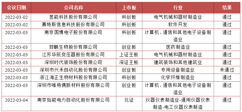 上周,10家企业经发审会审核,9家通过审核、1家未通过。