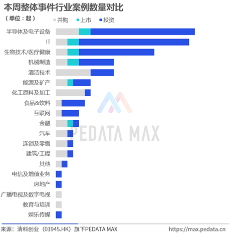 上周,半导体及电子设备、IT、生物技术/医疗健康行业的投资并购事件较多。