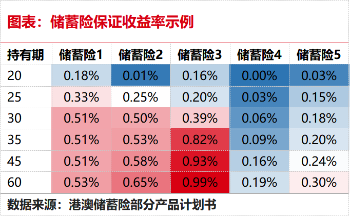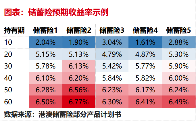港澳的收益储蓄型终身寿险归类不完全一致,多数被归类为储蓄险,少数被归类为投资成分保险等,从归类便可看出这类保险的主要功能为储蓄和投资,以下将这类产品统称为储蓄险。储蓄险设计类型以分红险为主,保障期多为120岁以上(以计划书展示为准),具有身故赔付责任,但是身故保底杠杆为100-110%(监管未对身故保底杠杆做过多限制),当现金价值与红利(如有)加总高于身故保底保险金时,身故保险金额以现金价值和红利(如有)为准,即此时退保与身故可获得的保险金相等,说明储蓄险类似于一个具有储蓄功能的账户。储蓄险长期持有可获得一定收益,收益分为保证和非保证两部分,其中:保证收益来源现金价值增长的部分,是根据精算原理计算的、保证给付的现金价值;非保证收益来源于年度或终期红利,根据保险公司的经营情况每年会有变动,于身故、退保/部分退保、期满、红利锁定等情况下发放。目前多数储蓄险长期持有的保证收益不超过1%,其主要收益来源于不保证的红利,同一款储蓄险的收益与性别、投保年龄等不相关。功能上,多数储蓄险支持无限次转换投保人、受保人,并且支持设置第二投保人,使得保单可以传承。