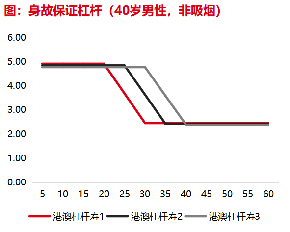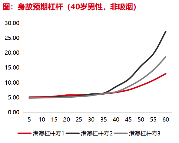 对比来看,大陆与港澳的消费杠杆型终身寿险共同之处在于两者均强调身故保障功能,初期的身故保障杠杆较高。区别之处在于:大陆杠杆型终身寿险多为普通型定额终身寿险,保额固定,不会在持有后期递减,但是现金价值增长缓慢,且无法超过保额,因此后期身故保障杠杆不会递增。大陆杠杆型终身寿险的定价相对简单,大部分产品在定价中仅针对不同年龄、性别的被保险人定价,未对不同生活习惯和健康程度的人群进一步区分风险定价,仅有少部分产品对不同风险人群进一步细分,大陆杠杆型终身寿险发展时间不长,经验数据有限,难以对风险细分,存在死亡螺旋风险;港澳杠杆型终身寿险多为分红型减额终身寿险,初期保证身故杠杆较高,一般高于大陆杠杆型终身寿险,但是保额可能随年龄递减,保证身故杠杆递减,不过依靠积累的分红,后期的预期身故保障杠杆依然呈递增趋势。港澳杠杆型终身寿险发展相对成熟,经验数据相对充足,因此产品定价会对不同风险的人群进一步细分,部分产品甚至将相同年龄、性别的人群根据健康程度、生活习惯等分为7档不同的风险等级,风险细分也将降低保险公司的死亡螺旋风险。