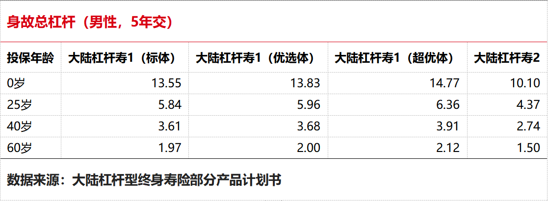 大陆杠杆型终身寿险又称定额终身寿险,以身故保障功能为主,身故保额固定,初期的身故杠杆(身故保额/累交保费)较高,而现金价值较低且增长缓慢,长期持有现金价值可接近于身故保额。杠杆型终身寿险可用于财富传承,初期高杠杆使其更加容易对接保险金信托或家族信托,这类产品给付偏向前期,但是后期基本没有增长空间,因此可搭配增额终身寿险以补充增额终身寿险前期的保障不足。杠杆型终身寿险较为传统,目前不是市场主推的产品类型,但是随着监管对增额终身寿险进一步限制以及提倡保险回归保障本源的政策推进,杠杆型终身寿险可能再次成为终身寿险主推的产品形态。
