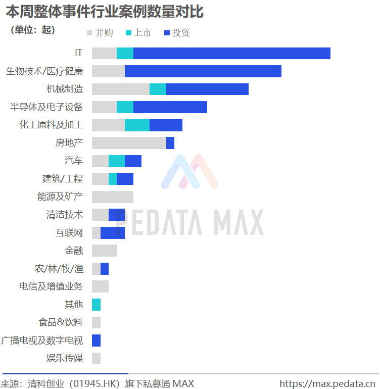 上周, IT、生物技术/医疗健康、机械制造行业的投资事件较多。