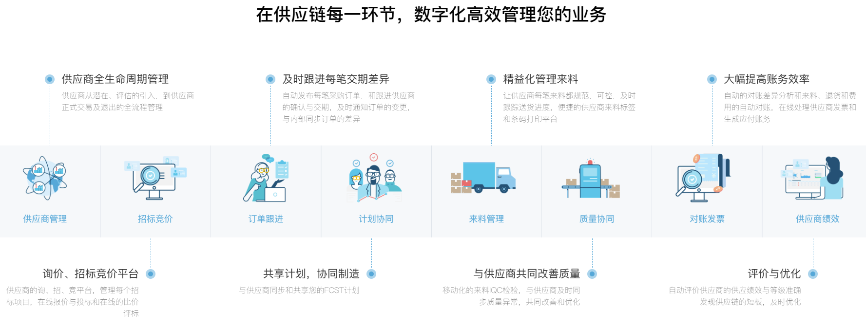 在面向生产性物料交易管理场景采购寻源到交付结算、供应商评估与管理协同的标准产品上,已打通90%以上制造业主流业务系统,新增对接了多家第三方电子签章、发票管理和支付平台。