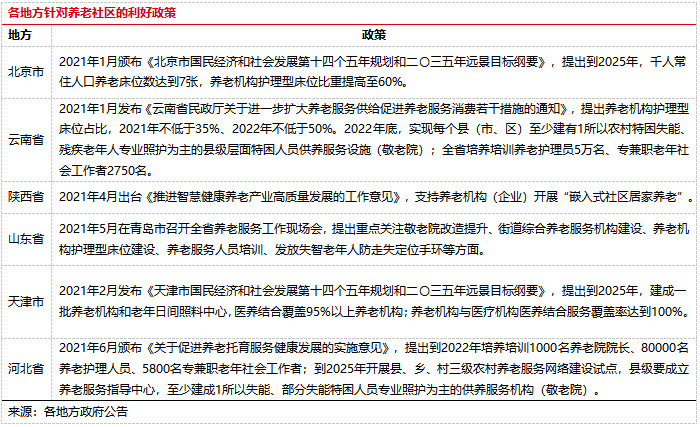 需求加速养老社区发展,利好政策频出推动养老社区发展。养老社区的发展可以分为三个阶段:第一阶段是2000-2010年,这一阶段人口老龄化问题还未凸显,养老主要以概念的形式开始探索,在没有政策和监管的足够支持下以销售作为导向,而服务不规范且规模较小;第二阶段是2010-2015年,养老社区开发形成一定规模,运营和服务意识更强,并且对客群分层,针对不同状态的老年群体形成了包括旅居养老、长居养老等不同的养老社区产品;第三阶段是2016年至今,养老社区在政策层面得到支持,以保险公司和房地产企业为主的企业在养老社区大规模布局。随人口老龄化加剧和居民收入水平提高,预计未来居家养老的比例将下降,居民对养老社区的需求将显著上升。这也促使各方面加速进入养老社区布局中。中央和各地方频出养老社区的利好政策,进一步推动了养老社区的发展。整体来看,养老社区增速在5%以上,可以覆盖老龄人口的增速,但是增速有放缓趋势。