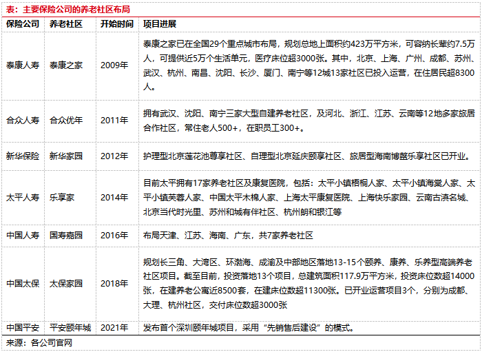 “保险+养老社区”具有天然优势。资产端来看,养老社区需要长期的经营和后续的养老服务保障,其盈利来源于长期的房租和资产增值,现金回流较慢,而在开发和运营的初期需要有大规模资金的持续投入和支持,保险公司擅长运用长期资金,险资的投资周期较长,回报要求低,追求一定的稳定性,这与投资周期长、可预期性较强且现金流稳定的养老社区相匹配。负债端来看,保险与养老社区可以搭配形成包括金融产品和养老服务的完整解决方案,增加与保险消费者接触的频率,形成相互促进和客户引流作用。以养老年金险搭配养老社区为例,当养老年金总交保费满足养老社区门槛时可对接养老社区的入住名额,领取的养老年金可用来交付养老社区的房费,对保险消费者而言现金流也得到了很好的规划。截至2021年3月,共10家保险公司投资了47个养老社区项目,床位数超过8.4万张。