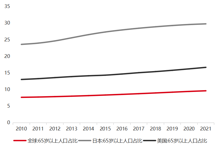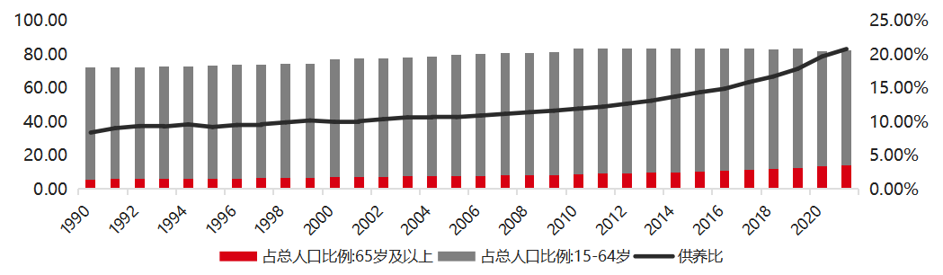 人口老龄化加深,供养比增长,如何养老?世界卫生组织(WHO)定义:一个国家六十五岁以上的人口占总人口的7%以上即称为老龄化社会(aging society);达14%即称老龄社会(aged society);达20%则称超老龄社会(hyper-aged society)。人类预期寿命延长和生育率下降造成世界范围内普遍出现老龄化趋势,且这种趋势呈现不可逆的特征。根据2022年中国65岁及以上人口占比为14.9%来看,中国社会已达到老龄社会的标准,且65岁及以上人口占比的增速呈上升趋势,说明增速尚未达到拐点,人口老龄化进程仍处于高速发展阶段。定义供养比为:某一人口中,老年人口数(65岁及以上人口)与劳动年龄人口数(15-64岁人口数)之比,可以看出供养比不断增加,依靠家庭实现自然养老越来越困难。中国人口规模大,依靠人口红利实现了高速经济发展,这也造成中国人口老龄化的进程更快而更加剧烈,对养老资源的规模和质量需求都在提升,但社会的财富积累不够充足,养老资源储备不足,社会还没完全做好迎接这一人口结构转变的准备。