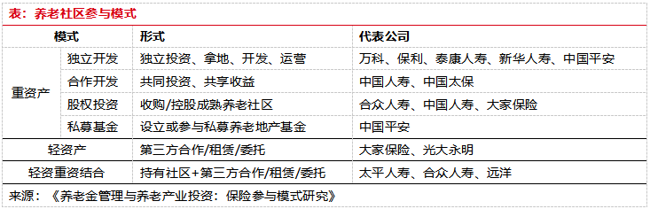 中国养老社区的主要参与者:险企和房企。保险公司和房地产公司是中国养老社区的主要参与者,按照所需资产和运营模式的区别可分为重资产运营、轻资产运营和轻重资产结合运营三类:其中重资产运营主要通过自建或收购养老社区的方式运营,所需资金规模大,投资周期较长,但是可统一管理,其养老服务品质更有保障;而轻资产运营主要通过三方合作、租赁、委托管理等方式运营,所需资金规模较小,投资周期较短,然而利润微薄,难以统一管理,存在养老服务品质不稳定的问题。