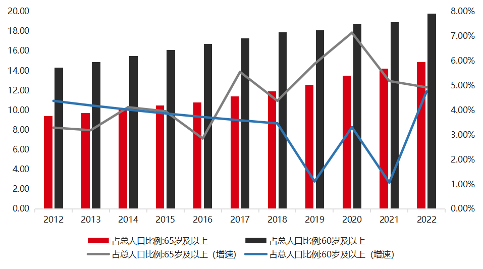 图:中国60岁以上及65岁以上老年人口占比与增速