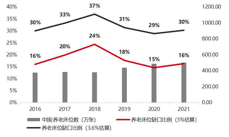 “9073”养老模式下,养老机构缺口明显。根据各地颁布的“9073”来看:90%的老年群体适合居家养老,既不需要护理也不需要床位;7%的老年群体适合社区养老,需要护理但是不需要床位;3%的老年群体需要机构养老,需要护理和床位。随人口老龄化加剧,居民对入住养老机构的名额有较大需求,养老机构数量逐年增长,但是养老机构缺口依然存在。下面以养老床位缺口替代养老机构缺口推算2021年的情况:按3%的65以上人口需要养老床位来估算,中国预估需要602万张养老床位,仍然有16%的缺口;事实上,养老床位配置比例目标3%仍和发达国家有一定差距,以美国为例,根据美国疾病控制与预防中心网站公布的数据,2016年共有170万张养老床位,占65岁以上人口比例为3.6%,按美国2016年养老床位配置比例的情况3.6%作为标准预估所需养老床位,中国预估需要722万张养老床位,仍然有30%的养老床位缺口。