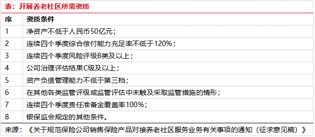保险公司开展养老社区项目需要强资质。养老社区项目繁多,品质良莠不齐,为保护保险消费者的权益,银保监会拟出台新规发展“保险+养老社区”,并于2023年1月4日发布了《关于规范保险公司销售保险产品对接养老社区服务业务有关事项的通知(征求意见稿)》。意见稿明确定义了保险公司的养老社区项目,强调保险公司仍应以保险保障作为主业,开展养老社区项目应量力而行并在开展项目之前充分调研。此外,意见稿规定了保险公司开展养老社区项目需要满足的资质,涉及保险公司规模、偿付能力、经营风险等多个方面,考虑到养老社区项目经营周期较长,只有具有长期稳定经营能力的保险公司才能良好经营养老社区项目。
