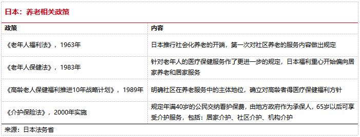 日本:小规模多功能的社区养老为主。日本的人口老龄化程度更深,因此其养老政策体系较为完善,在政策的支持下,日本的养老服务迅速发展。目前日本的社区养老组织形式主要有四种:政府组织、政府资助下的福利组织、志愿者组织、企业式养老服务组织,多以社区为载体,多数服务人数为20-30人,但是服务齐全,可分为长期照护、日间照护、上门照护,以满足不同的养老需求。
