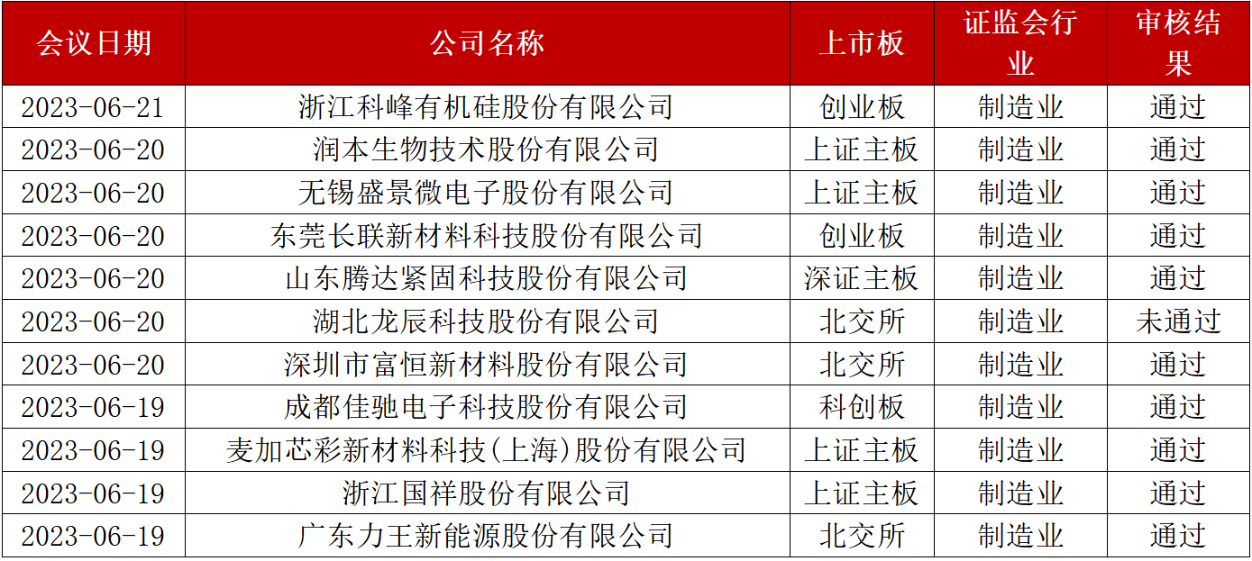 上周,共11家企业经发审会审核,其中10家通过审核,1家未通过。